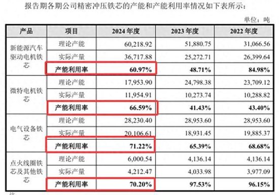 华新精科扩产的必要性以及新增产能如何消化受到关注。2024年,华新精科新能源汽车驱动电机铁芯、微特电机铁芯、电气设备铁芯和点火线圈铁芯及其他铁芯的产能利用率分别为60.97%、66.59%、71.22%和70.20%。