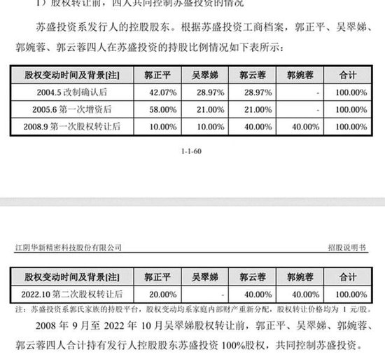 实际上,2008年9月至2022年10月,郭正平之妻吴翠娣也曾是华新精科的实际控制人之一。2022年10月,也就是华新精科IPO获上交所受理的前夕,吴翠娣将其持有苏盛投资(华新精科控股股东)的全部10%股份转让给郭正平,不再直接或间接持有公司任何股份,因而不再作为华新精科的实际控制人;吴翠娣也不再担任苏盛投资及其子公司子泰机械、德诚钢铁的法定代表人。