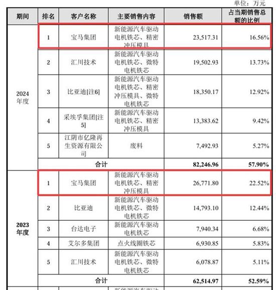 2022-2024年,华新精科的营业收入分别为11.9亿元、11.89亿元和14.21亿元,净利润分别为1.14亿元、1.56亿元和1.5亿元。其中2023年和2024年的第一大客户均是宝马集团,销售额分别为2.68亿元和2.35亿元,占当期销售总额的比例分别是22.52%和16.56%。