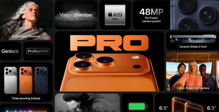 iPhone 17 Pro 系列则面向更高阶的用户,带来更具突破性的升级。外观上最显著的变化是摄像头模组改为横向大矩阵布局,新增类似铜色的机身配色,Pro Max版本的厚度增至8.725mm。机身采用一体成型航空级铝合金中框,后盖为超磁晶面板,抗碎裂性能相比前代提升4倍。性能方面,A19 Pro芯片配合VC均热板散热系统,官方称其散热效率为钛金属的20倍,持续性能输出相比 iPhone 16 Pro 提升40%。存储方面,Pro Max首次提供2TB版本,eSIM机型的视频播放续航达到39小时,续航表现突出。