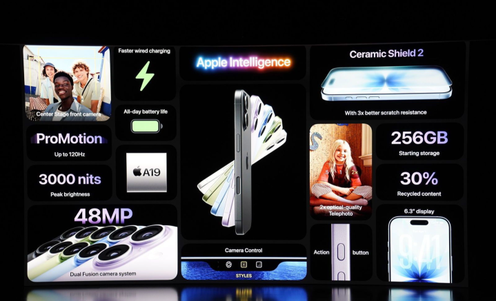 iPhone 17 标准版迎来多项重要升级。屏幕方面,搭载一块6.3英寸支持 ProMotion 自适应刷新率(1Hz-120Hz)的显示屏,可实现更流畅的动态效果与更节能的静态显示,四面边框也进一步收窄。核心性能上,标准版搭载基于3nm制程的A19芯片,配备6核CPU与5核GPU,苹果特别强调其图形处理能力有“大幅进步”。影像系统仍为双摄设计,主摄为4800万像素,搭配超广角镜头;前置摄像头传感器尺寸增大一倍,改为正方形开孔,视野更广。机身防护显著增强,搭载第2代Ceramic Shield陶瓷护盾,抗刮擦性能提升3倍,同时外盖采用全新苹果设计涂层,硬度更高。起售价为799美元(国内定价为5999元人民币)。